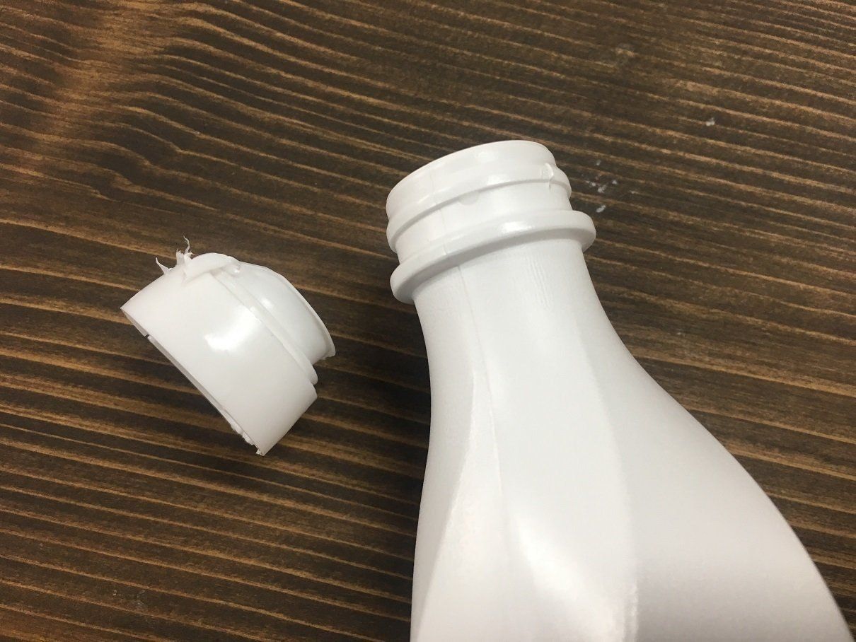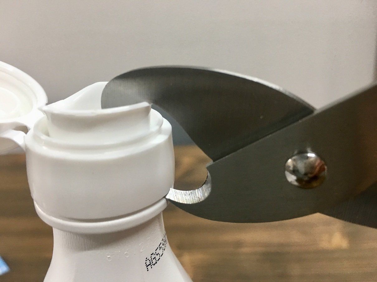 キャップの注ぎ口部分に対して、ひっかけ刃(長い方の刃)を注ぎ口の上に、容器とキャップの隙間にとんがり刃(短い方の刃)をいれて、そのままはさみを上に持ち上げるだけで、簡単にキャップが外れます!