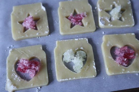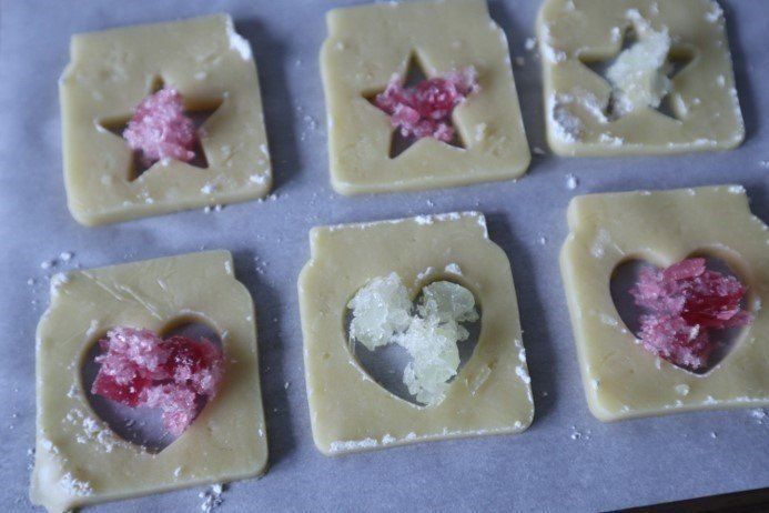 ステンドガラス風の抜型で抜いたら、真ん中に砕いた飴を入れてオーブンで焼けば完成!