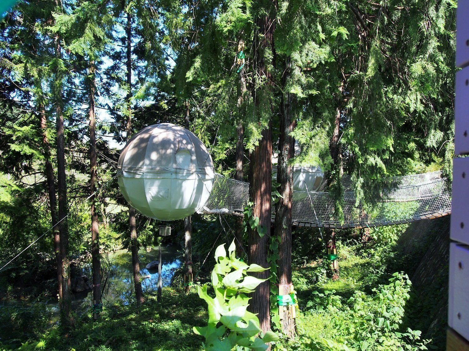 2019年8月にオープンしたばかりのグランピング施設。もともとあったキャンプ場と日帰り温泉施設をリニューアルして、さまざまな宿泊体験を提供するグランピング施設になりました。豊かな自然に囲まれながら、グランピングキャビン、テント、フロートドームテント、ドームキャビンなどで宿泊を楽しむことができ、施設内に日帰り温泉とプール、レストランがあります。