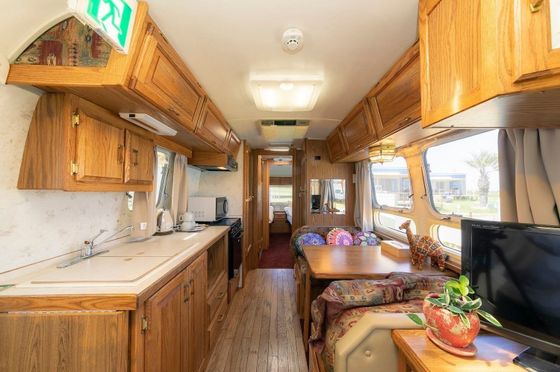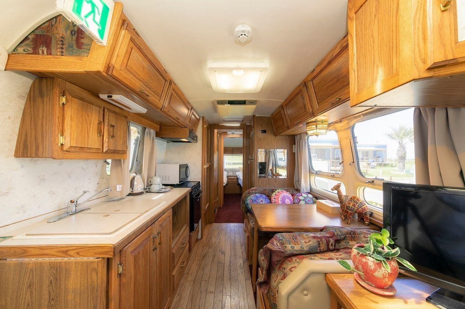 キャンピングトレーラーとして人気の「エアストリーム」は、インスタ映え間違いなしのおしゃれな内装が魅力。トレーラー内にキッチン、ダイニング、寝室、シャワールームやトイレがあり、季節を問わず快適に過ごせます。