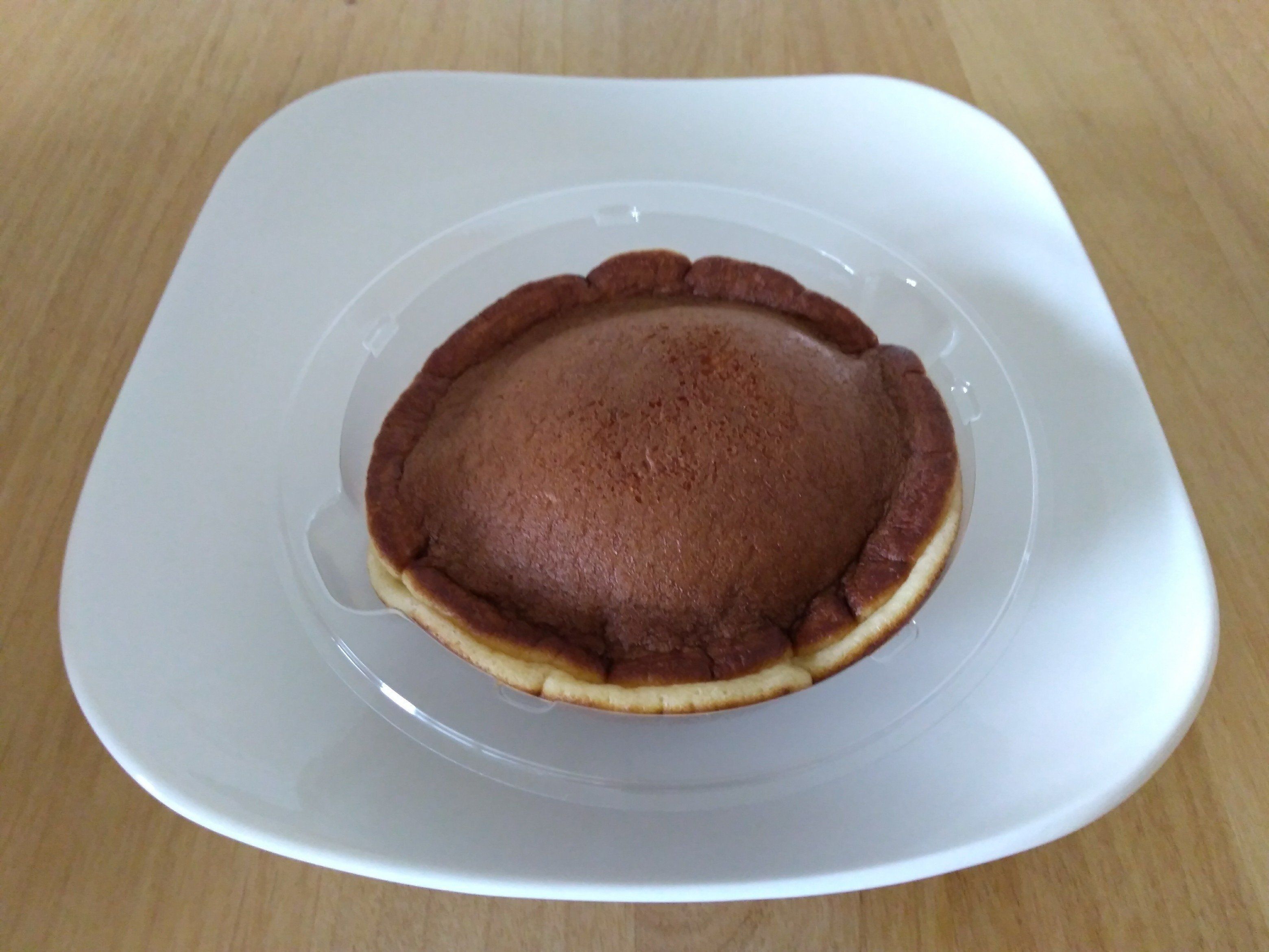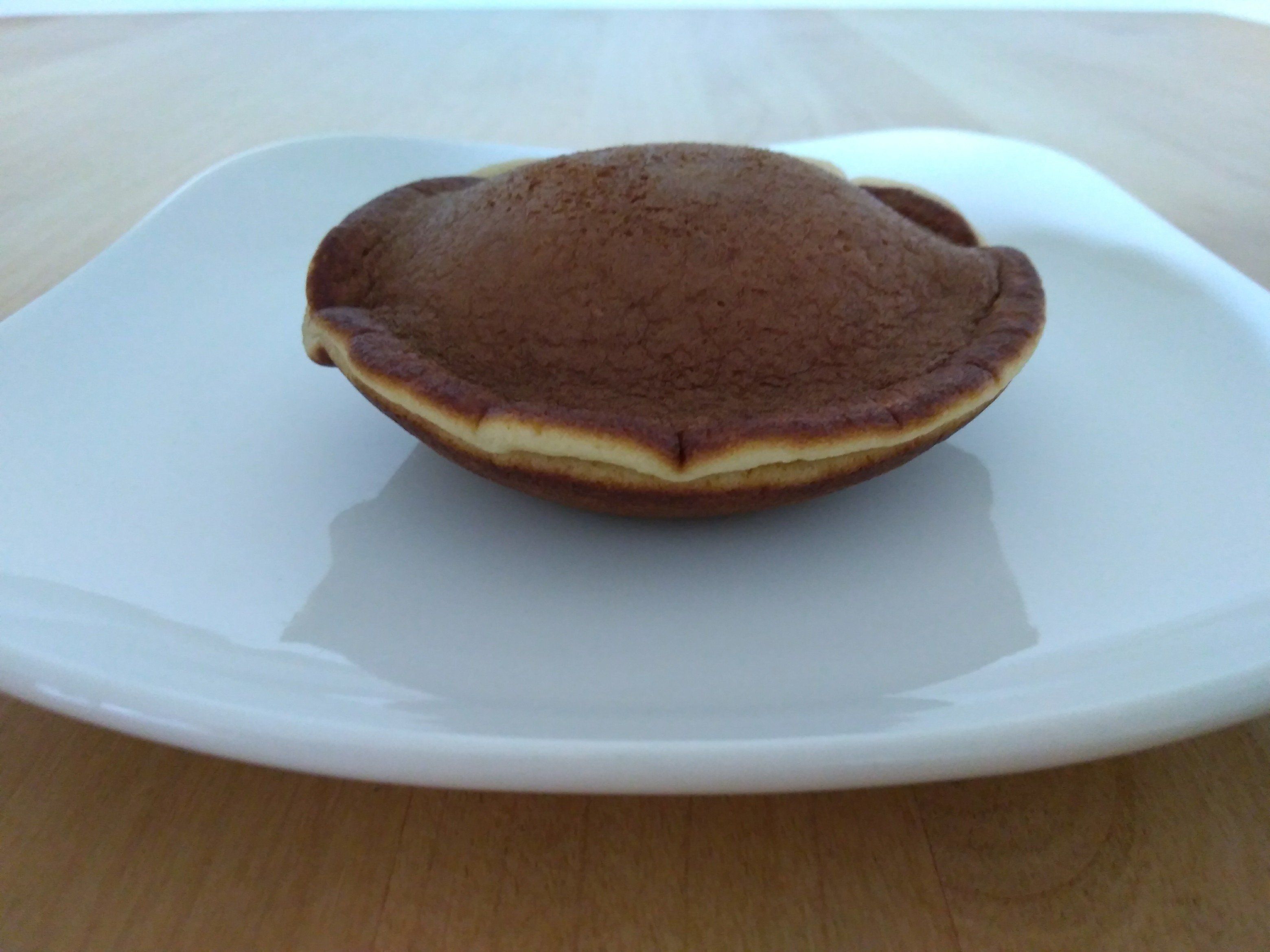 ケースから取り出すと、どら焼きらしい鈴の形。手に持つと、しっとり感と、中身がギュッと詰まったどっしり感を感じます。この中にプリンとマロンが入っているんですね~!