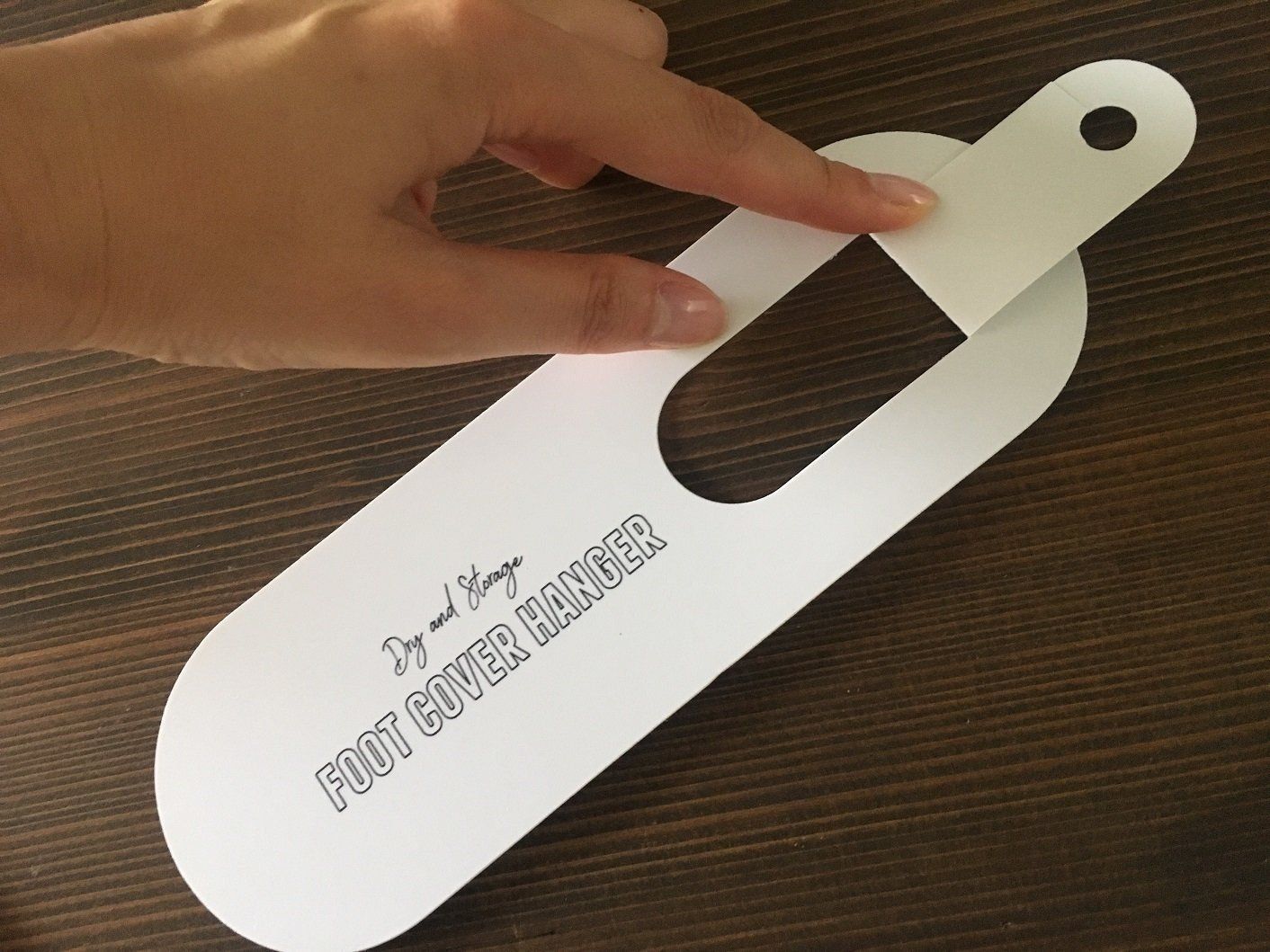 「フットカバーハンガー」を使うときは、写真のように本体に靴下を履かせるようにセッティングして、突起部分をハンガーやポールに引っかけるだけ。乾いたらこのまま収納できるのもうれしいポイント。