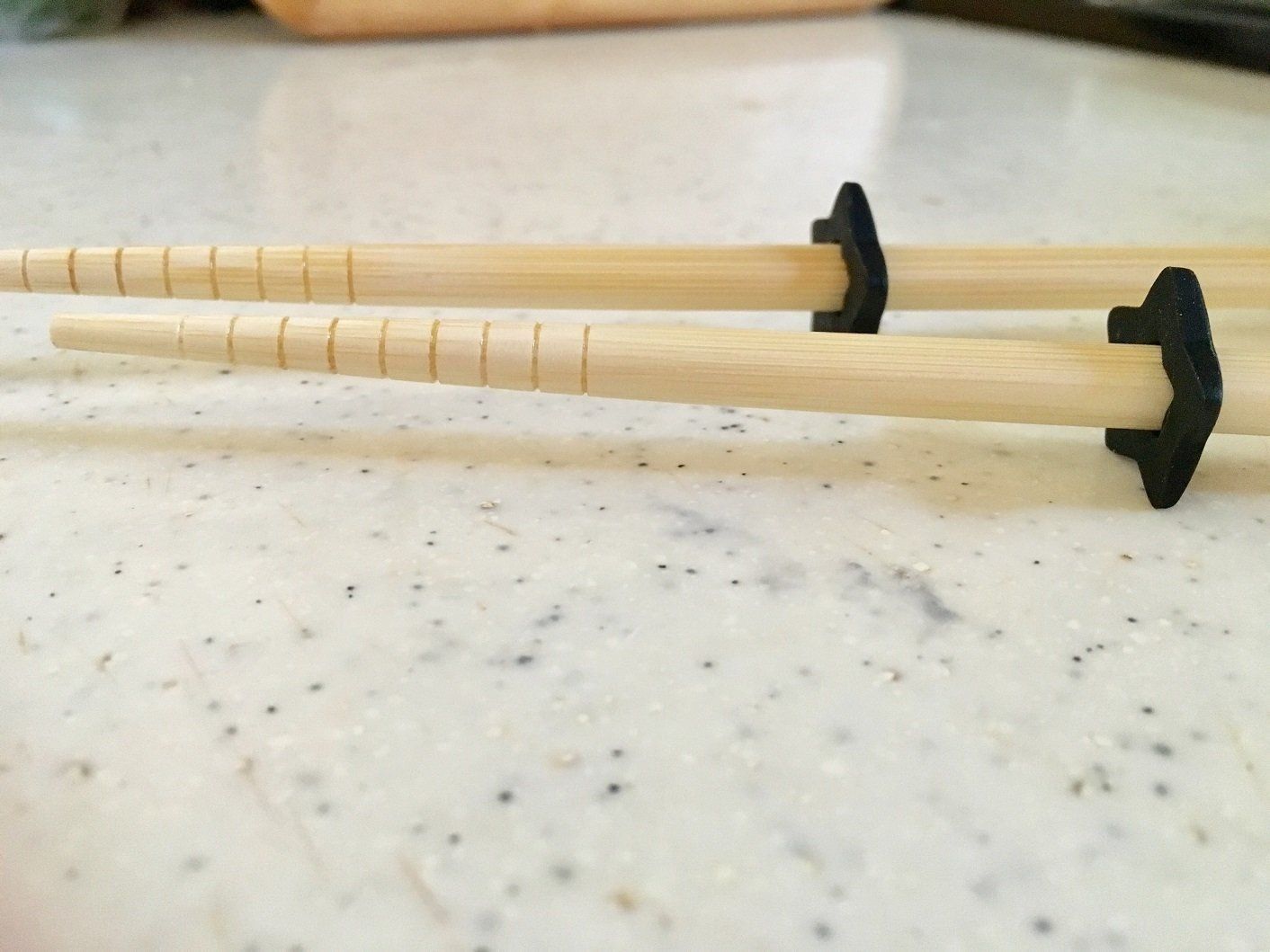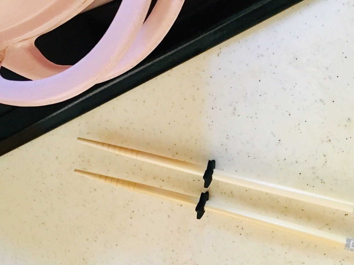 使うときは中央の穴に菜箸を先端からさしていくと、写真のようにキッチン台に置くと箸先が浮きます!菜箸スタンド位置は中央くらいでも置きやすかったです。もちろんこのまま調理を続行しても邪魔にならない!洗うときに外して、またセットして置いておいてもいいですよね。