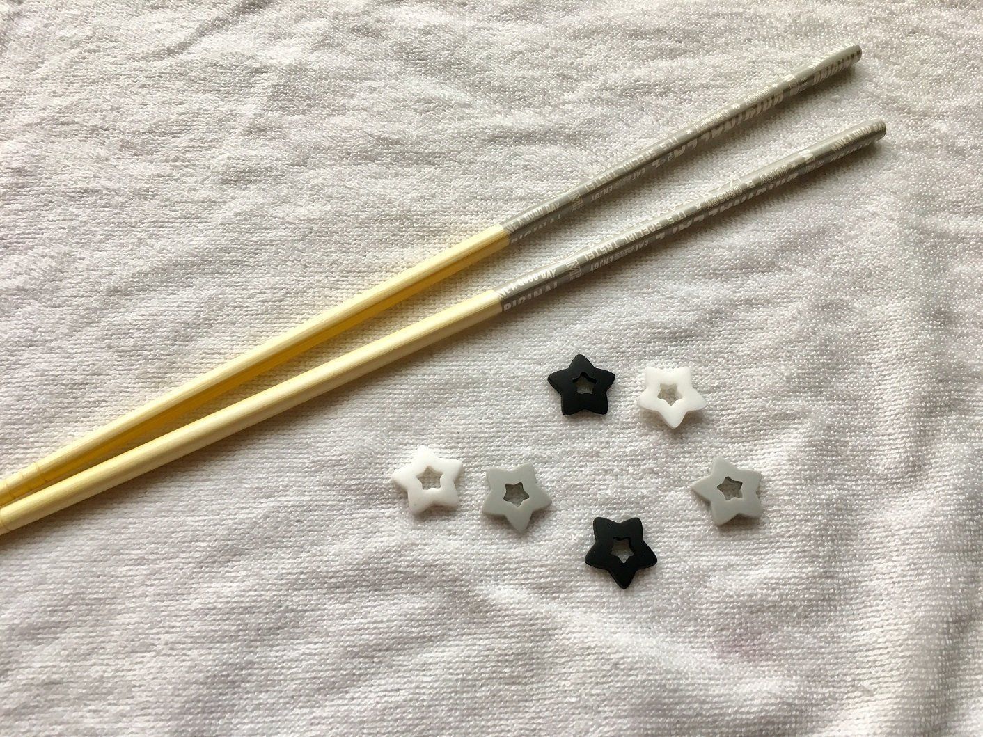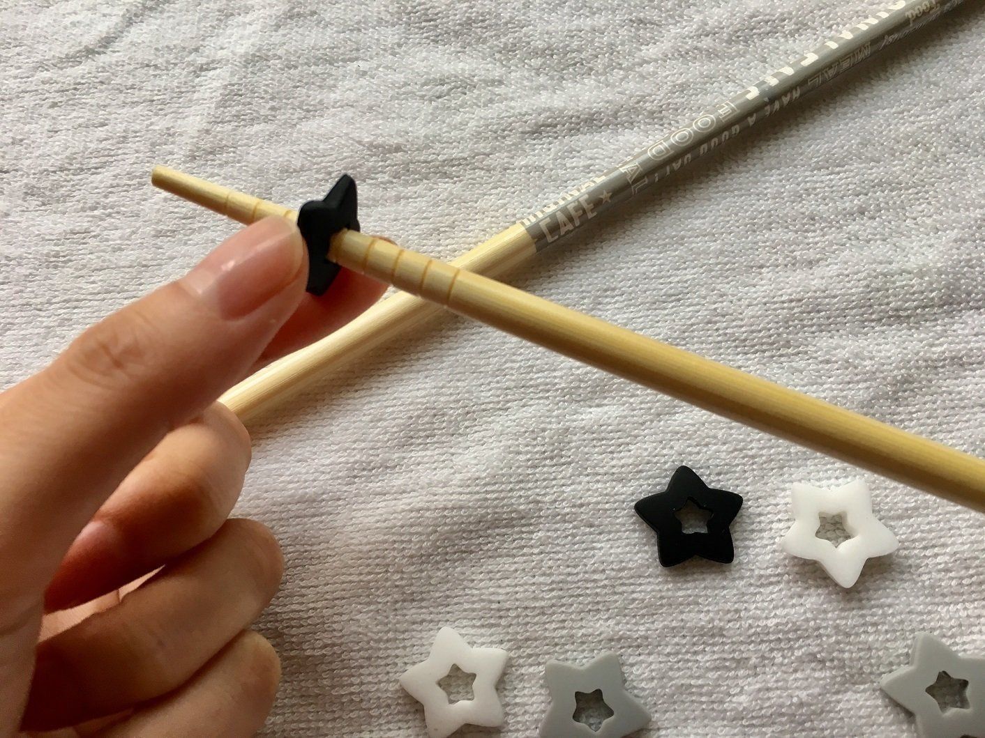 サイズは縦横とも約1.8センチです。中央にある星型の穴の菜箸を入れて使うのですが、対応サイズは直径5〜10ミリくらい。隣にある菜箸も同じくセリアで購入したもので、この菜箸であれば問題なく使うことができます。
