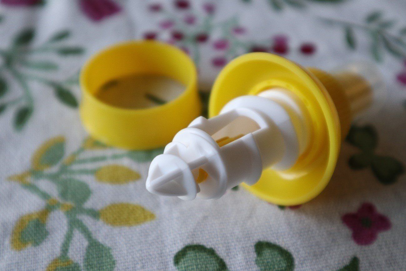 スプレー本体は、上部がスプレー口に、差込口はドリルのようになっています。それにレモンを置くためのリングが付属。意外とシンプルなつくりなので、これをねじこむだけで本当にレモンスプレーになるのか…、使う前は半信半疑な気持ちに。