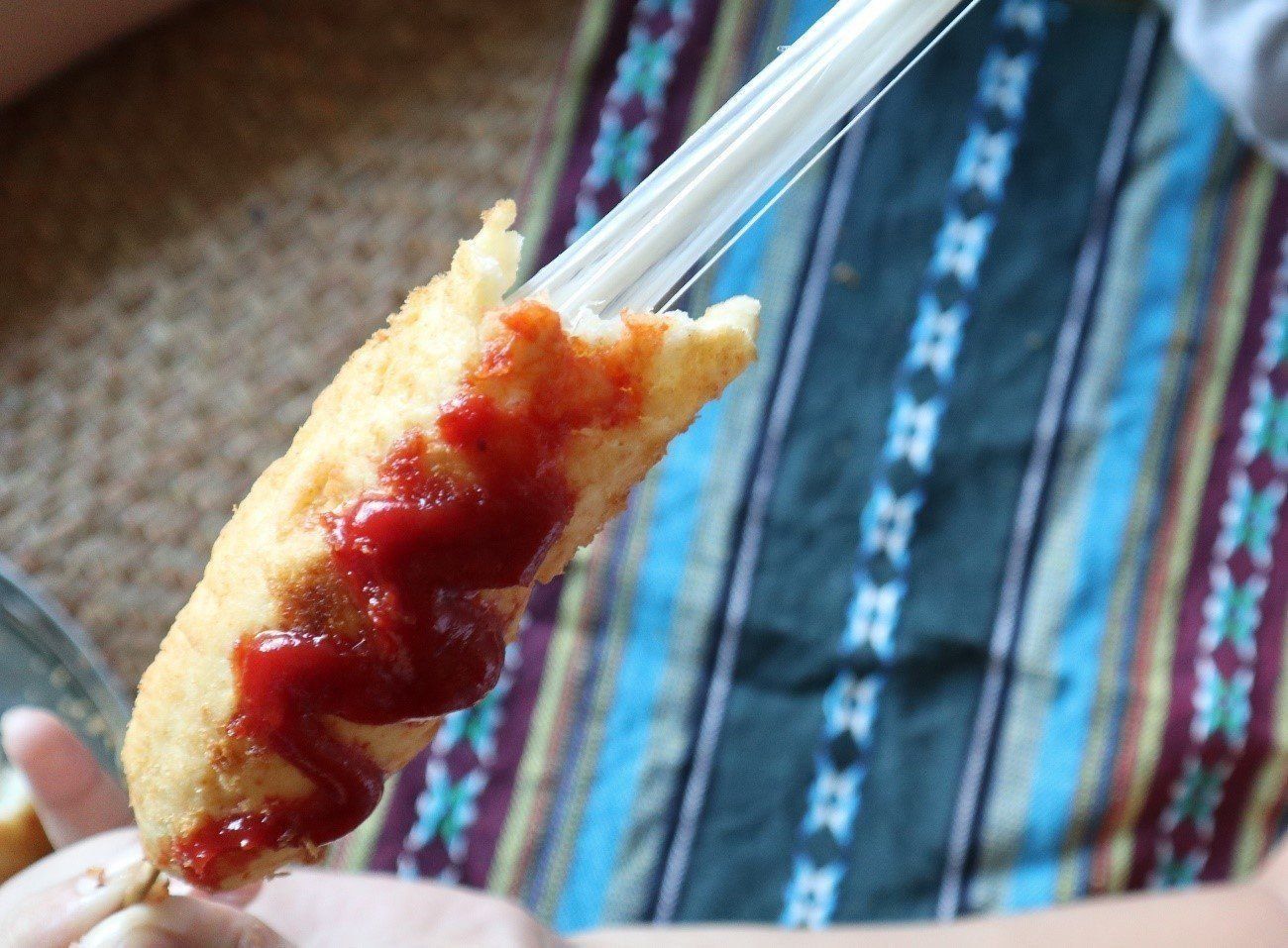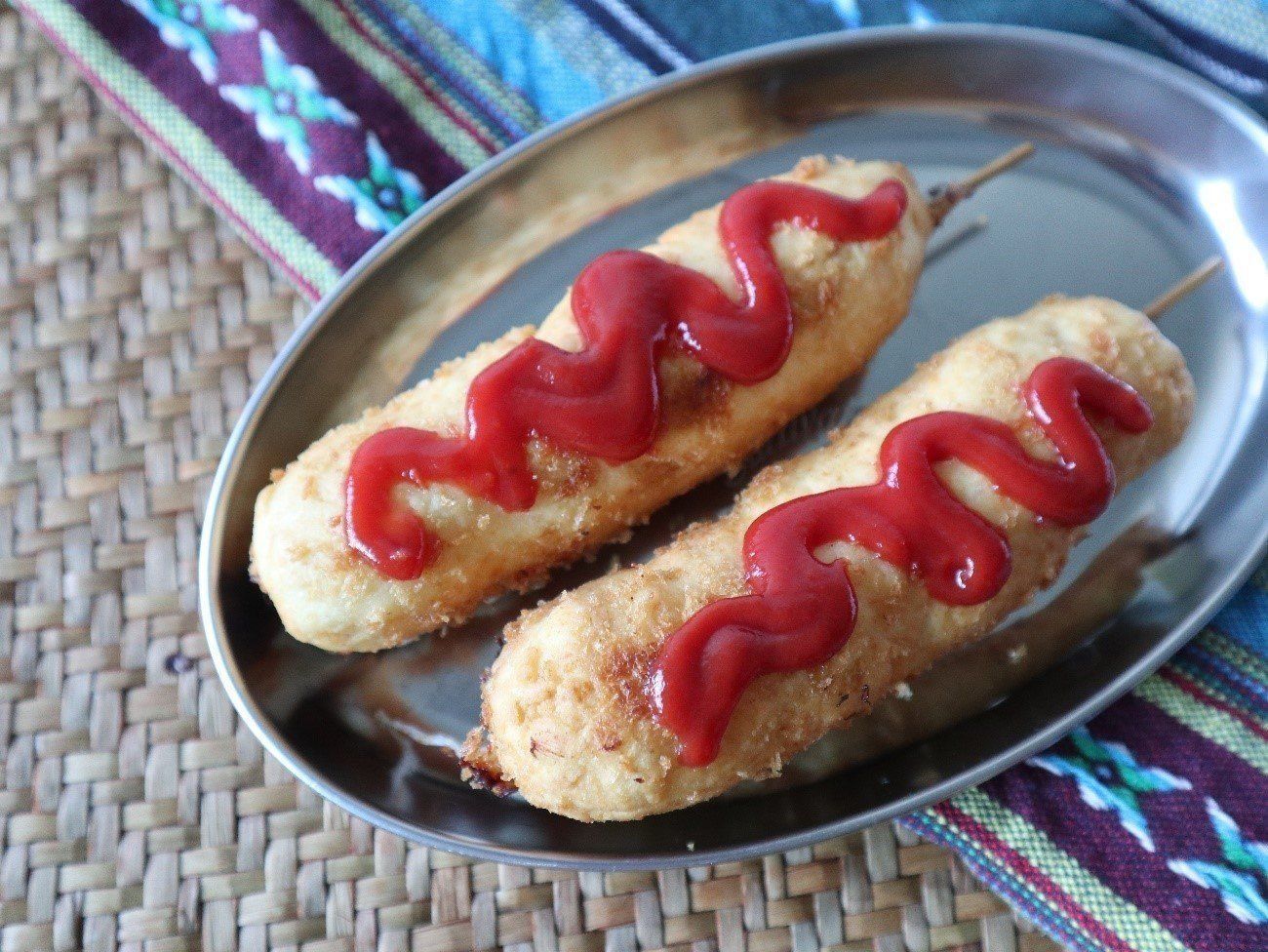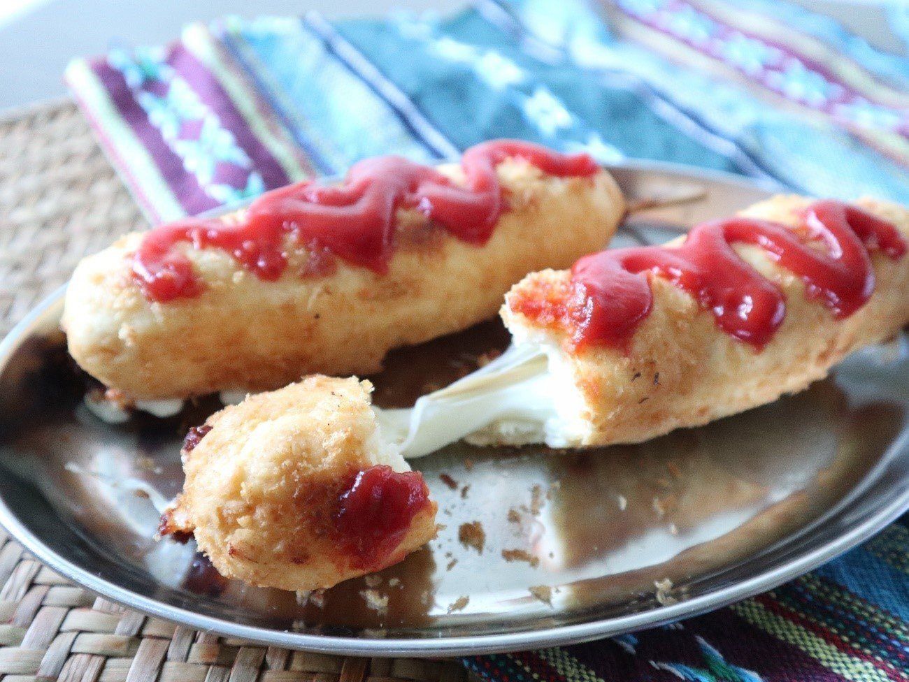 今回調理に使った材料は、チーズホットグミックス粉、さけるチーズ、パン粉、揚げ油、ケチャップなので、1本あたり約200円でできます。お店では500円ほどで売っているので安価につくれます!そんな点もいいですね♪