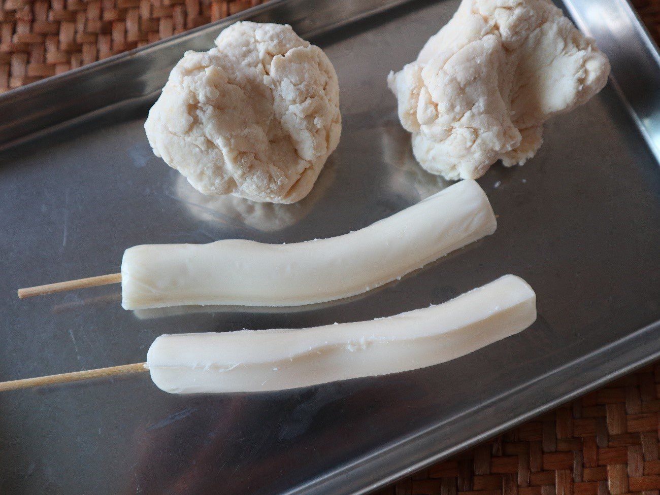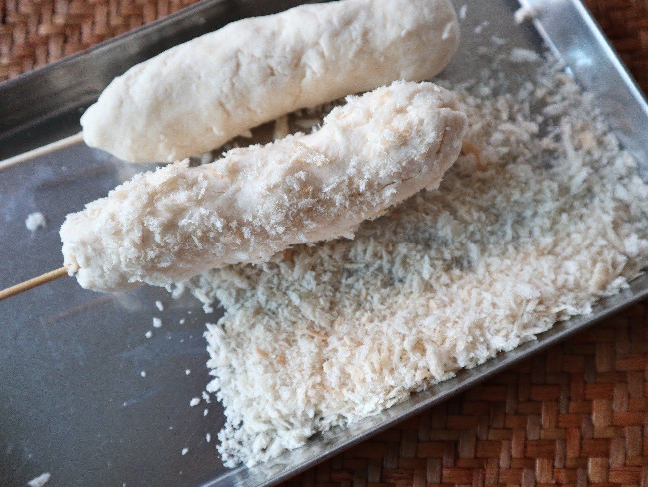 つくり方はとても簡単!ミックス粉と水を合わせてよく混ぜて、生地を2つに分けたら、串をさした具材(今回はさけるチーズ)に生地を包みます。ポイントは、具材が見えないように包むこと。しっかり包まないと、揚げたときに中の具材が出てきてしまいます。とくにチーズはとろけてしまうので注意。包んだら、油で揚げて完成です。