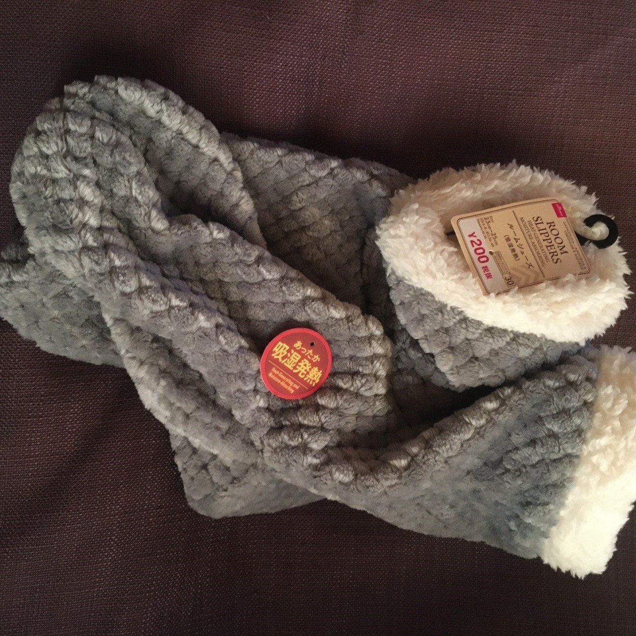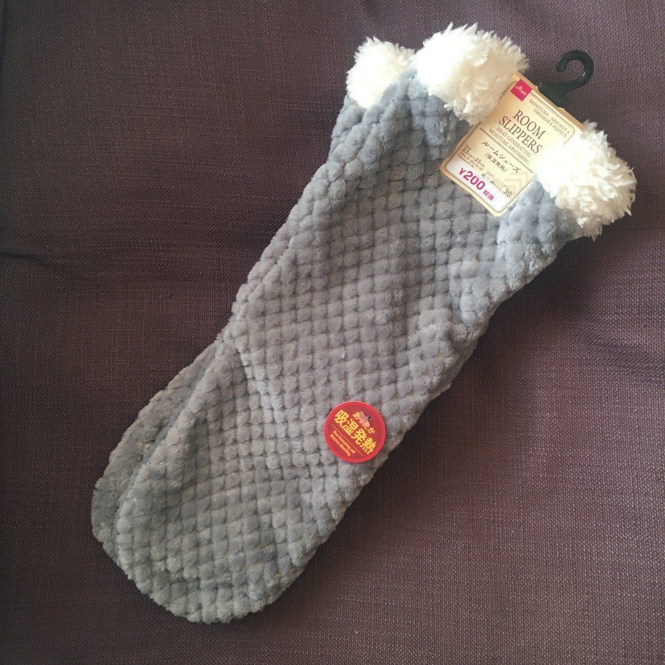 日本語の商品名は「ルームシューズ」と書いていますが、英語名は「ROOM SLIPPERS」でした。見た目は、まるで靴下なので、シューズなのかスリッパなのか、名前だけではなんだかよくわかりません。