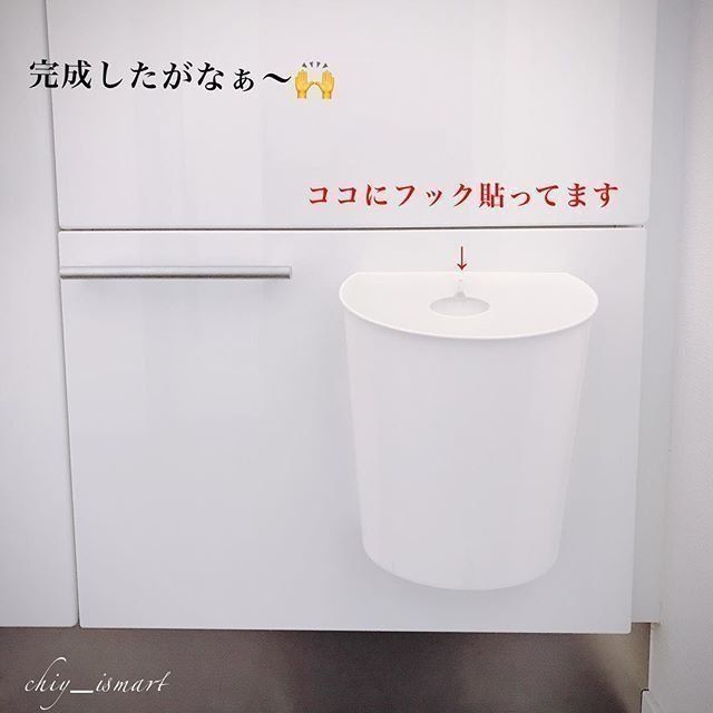 水まわり用品は「吊るして収納」が定番化してきましたが、もう水まわりに限らずどの用品も吊るせるものは吊るしちゃったほうが掃除が楽になります。準備するものは半円のごみ箱と粘着ソフトクッション、フィルムフックと3つだけ。