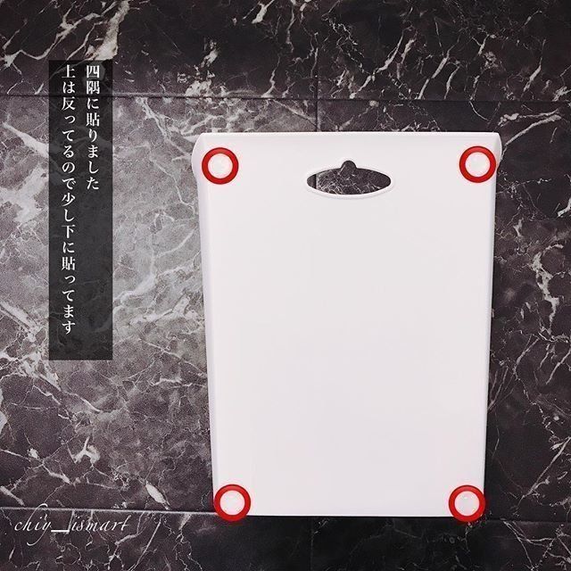 粘着ソフトクッションをキズ防止に四隅に貼りつけ、あとはフックにかけるだけで完了です。好みの場所、好みの高さでごみ箱を設置できますよ。