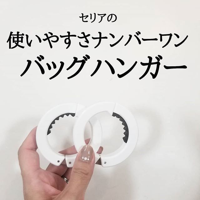 外出先で便利なのが、バッグのハンドル部分にかけて吊るせるバックハンガー。でも種類によっては細いハンドルではうまくひっかからないことも。セリアのバックハンガーはがっちりホールドするので、どの大きさのバックハンドルでも問題ありません。