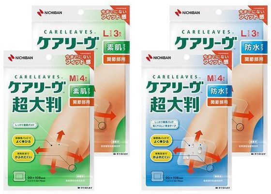 新しい「ケアリーヴ超大判」は、ひざやひじなどの関節部のキズに適した救急絆創膏です。新開発の「伸縮パッド」が元気に動き回るお子さんの皮ふの動きにぴったりフィット。防水タイプは、おふろなどの水に強い上、透湿性が高いのが特長。お子さんが嫌がりがちなはがすときの痛みも少ないです。