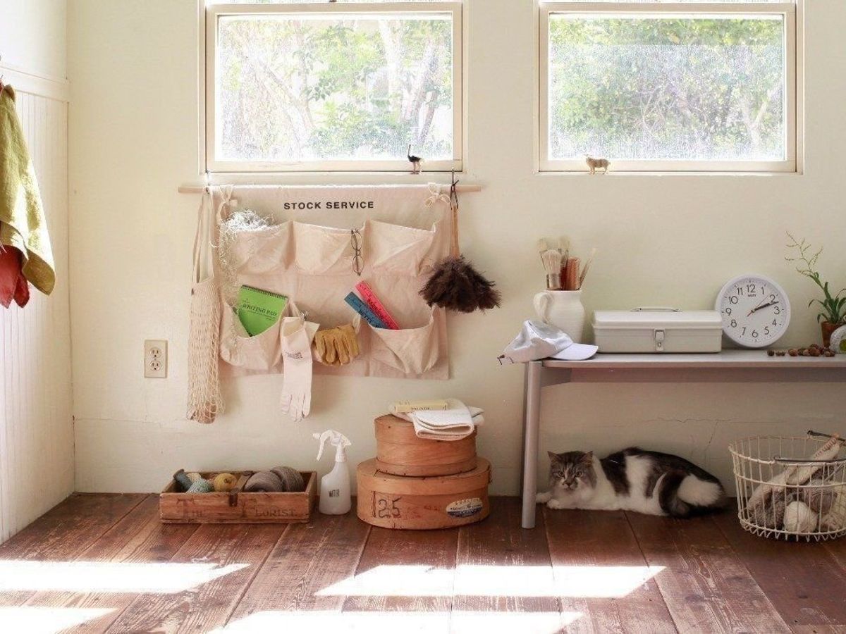 ストックサービスポケット 4800yen, 帽子 4500yen, ゴム手袋 1200yen, 右壁のエプロンバッグ 3500yen /以上ヴォイリーストア 流木のホウキ 3500yen, 流木のハンガー 5000yen /共にシボネ青山 スプレー800yen, ネットバッグ 1400yen /以上トゥデイズスペシャル自由が丘 KARIMOKU N EW STANDARD キャストールダイニングベンチ 47000yen /カリモク家具 イギリスUNITY CLOCKS の時計 2400yen, ラウンドボックス上のマルチクロス 上 800yen, 下 1000yen, 左の壁にかけたリネンクロス各 1800yen /以上ザ テイストメイカーズ & コー