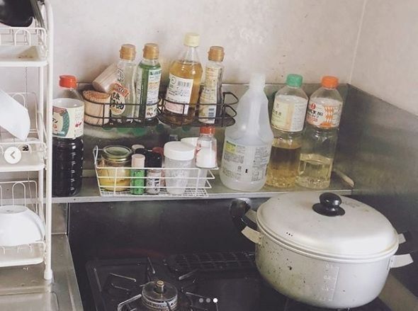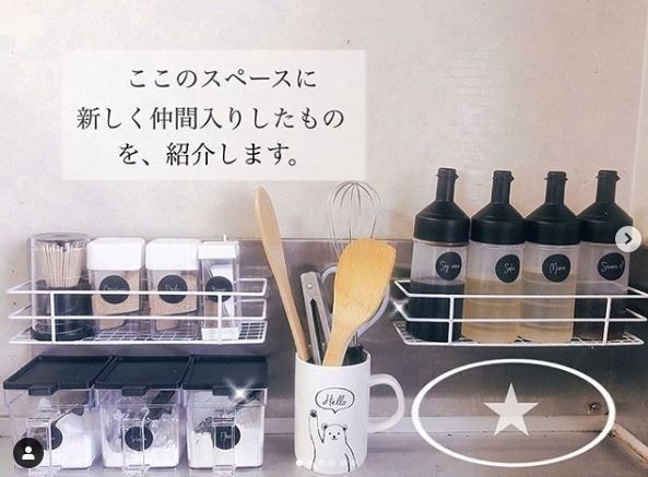 こちらのキッチンの調味料入れは全てダイソーの商品。粉末調味料や液体調味料がきれいに整頓されていますね。デザインもシンプルですっきり、使いやすそうに分けられているところもポイントです。