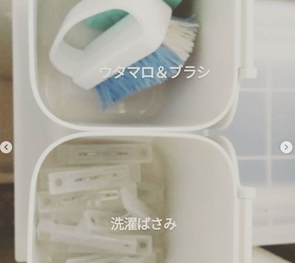 たとえばこちらは、脱衣所での活用方法。洗濯ばさみやブラシなどをスクエア収納BOXに入れています。脱衣所など洗濯機のある場所は、いろいろこまかいものがありますよね。そんな小さなものを収納するのにピッタリのサイズです。