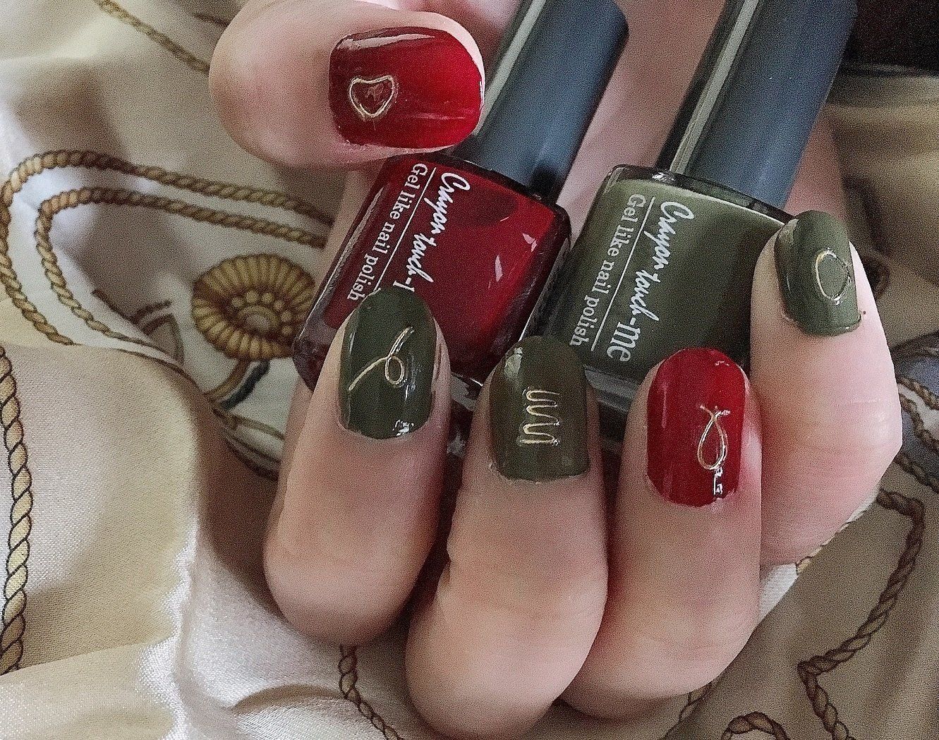 ネイルは、秋冬を意識してボルドーとモスグリーンというディープな2色を選びました。どちらも2回塗りしましたが、マット過ぎない質感なのでネイルボトルの見た目よりも明るく仕上がりました。