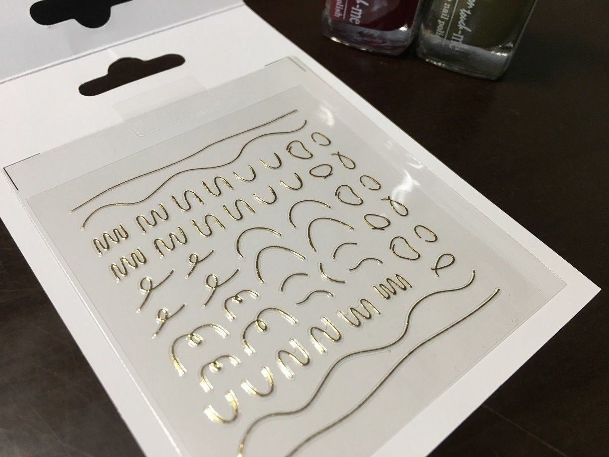 今回は、トレンドのワイヤー風のネイルシールを選んでみました。実際のワイヤーは厚みが出てジェルネイルでないとなかなか難しいですが、これはシールなので貼るだけでOK!粘着部分は透明で目立たないから、好きなところに貼れますよ。
