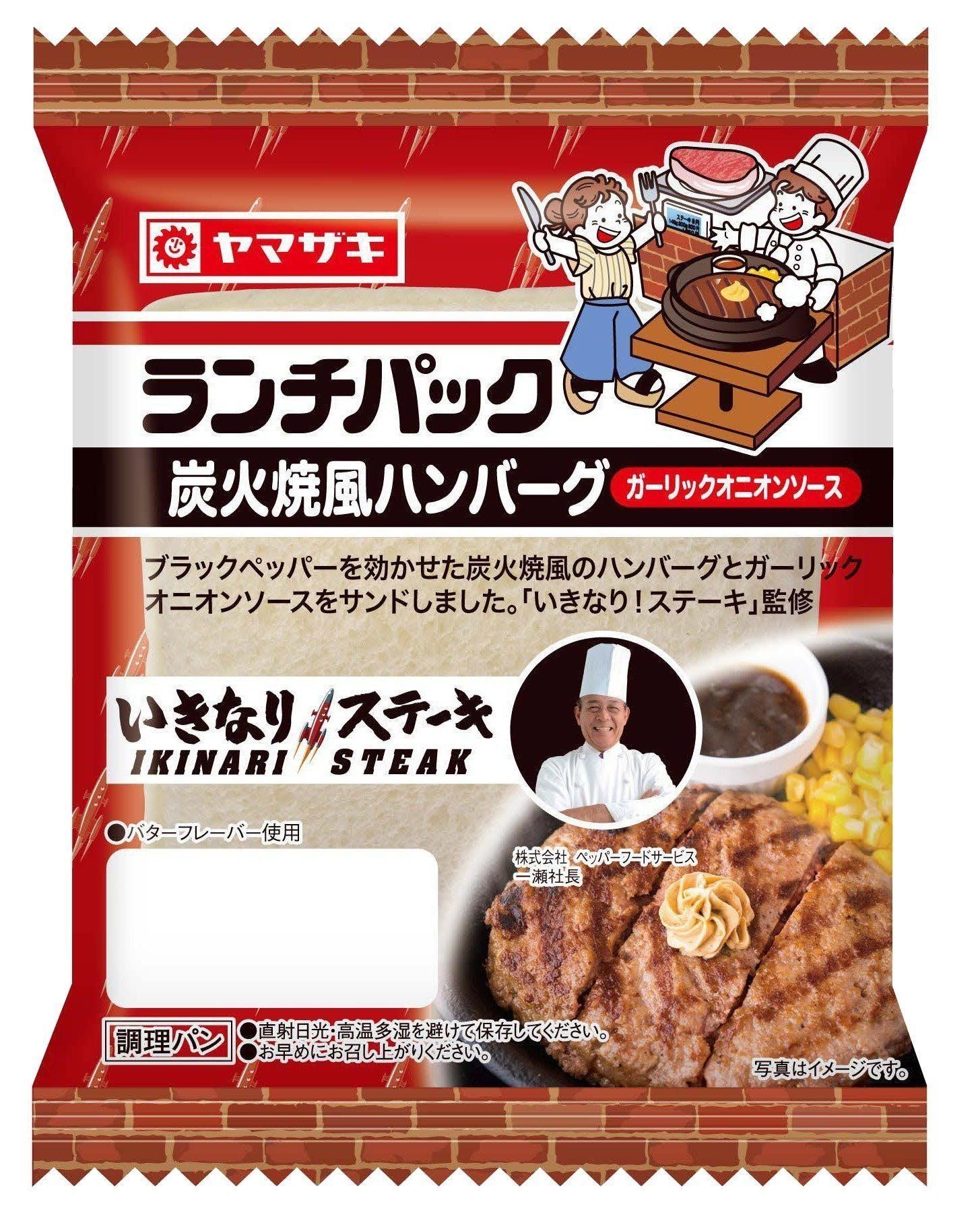 1984年に誕生し、発売35年目を迎える歴史ある製品『ランチパック』とのコラボです。ブラックペッパーを効かせた炭火焼風のハンバーグとガーリックオニオンソースをサンドした、『いきなり!ステーキ』監修の製品です。