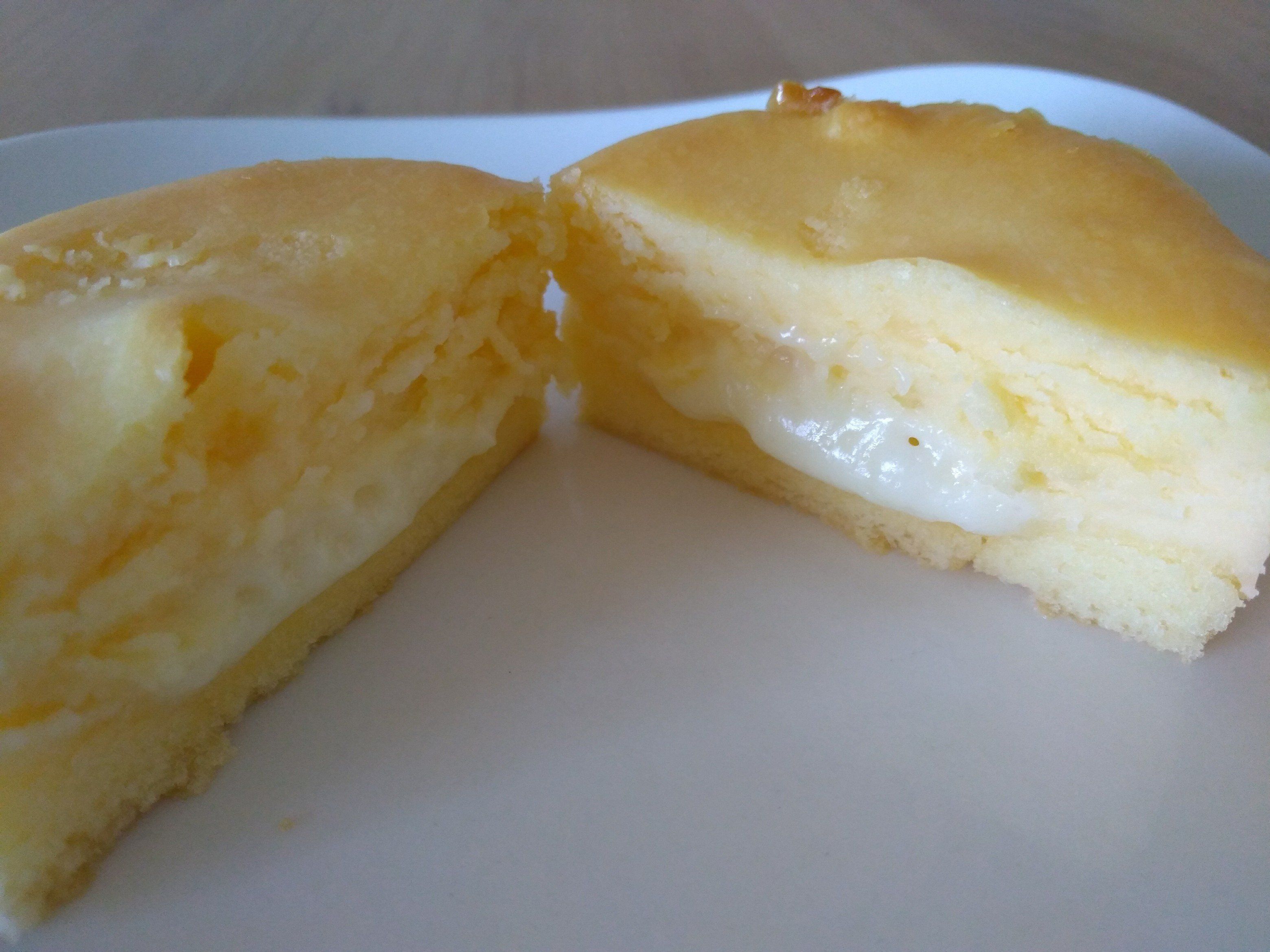 中央の白い部分がのび~るチーズクリームです。ナイフを抜くとき、確かにチーズクリームが糸を引いていました。スライスチーズをのせて焼いたチーズトーストをカットしたときの伸び方に近いかもしれません。また、クリームの中の黒い点はバニラビーンズだそうで、そんなところもうれしいポイント。