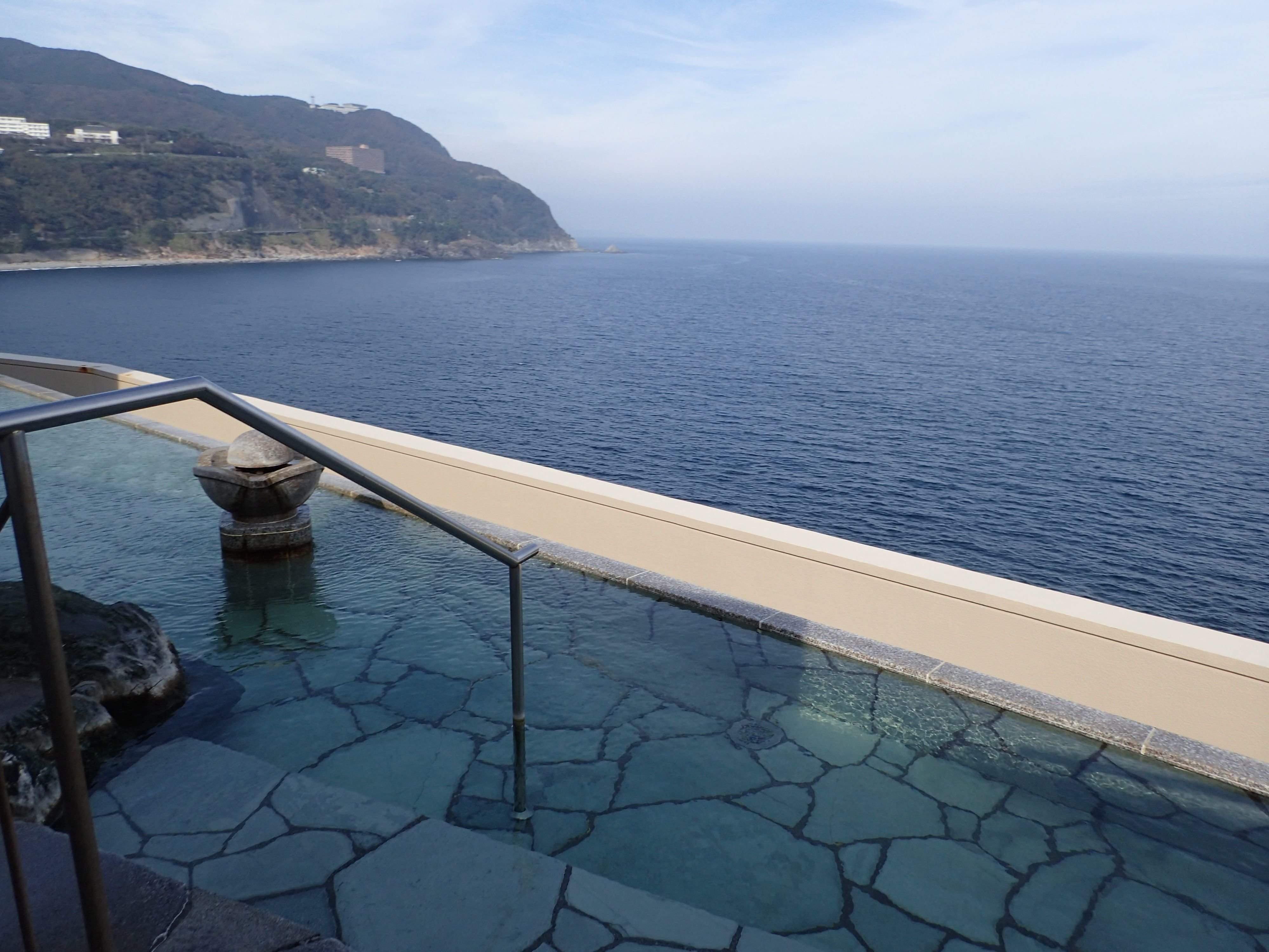 伊豆稲取にある海辺の温泉旅館。新鮮な海の幸と展望露天風呂からの雄大な海の景色が魅力です。泉質は、よく温まる塩化物泉。ふたつある露天風呂は時間によって男女入れ替えとなりますが、どちらも早朝4時から入浴可能。人気の宿のため、年末年始は早くから満室状態です。お正月に限らず、日の出時間の入浴はおすすめです。