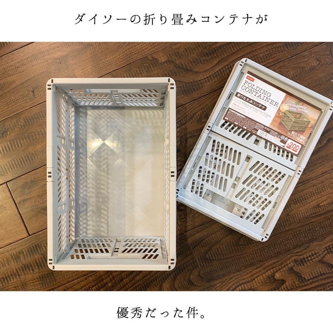 200円で販売されている折り畳コンテナ。使わないときに折り畳んでおけるのに、頑丈なところもうれしいポイント!パントリーやクローゼット、倉庫などさまざまな場所で活躍します。