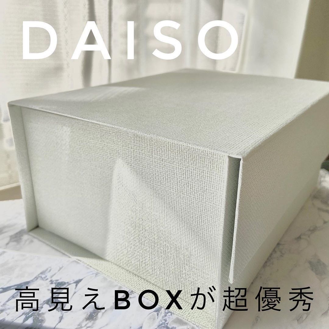 100円とは思えない高級感のあるBOX。カラーはシンプルなライトグレーでどんなインテリアとも馴染みます。ふたに磁石がついているため、しっかりと閉まる魅力も!