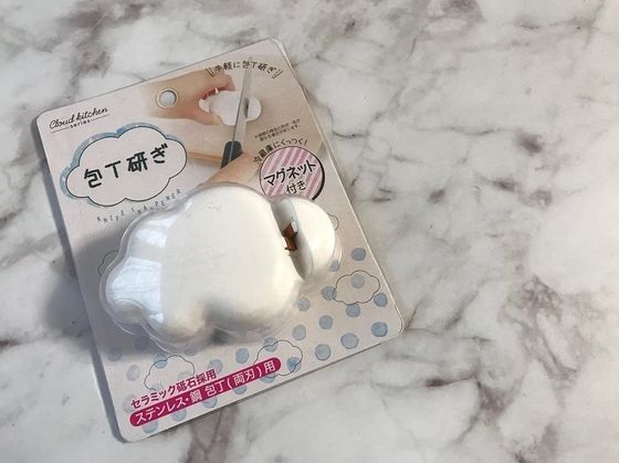 かわいらしい雲型のアイテムは、何と包丁研ぎ。マグネットつきなので、使わないときは冷蔵庫や食洗器などにくっつけて収納できます。手軽に包丁を研げるのは、うれしいですね。