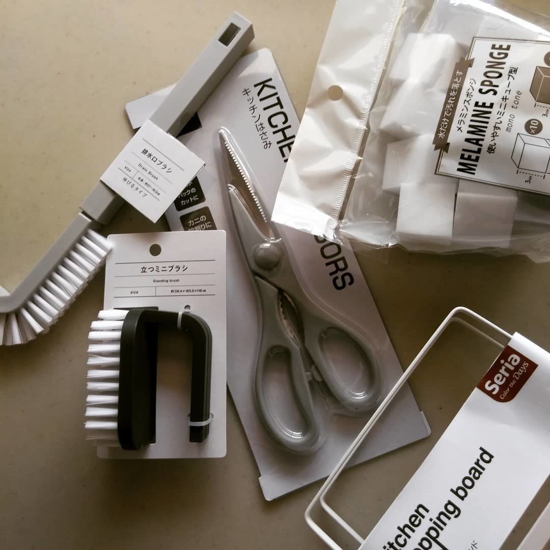 キッチンバサミや立つスポンジ、排水口ブラシなどキッチンで役立つアイテムは、すべてセリアでそろいます。モノトーンでそろえると統一感もあっておしゃれ!