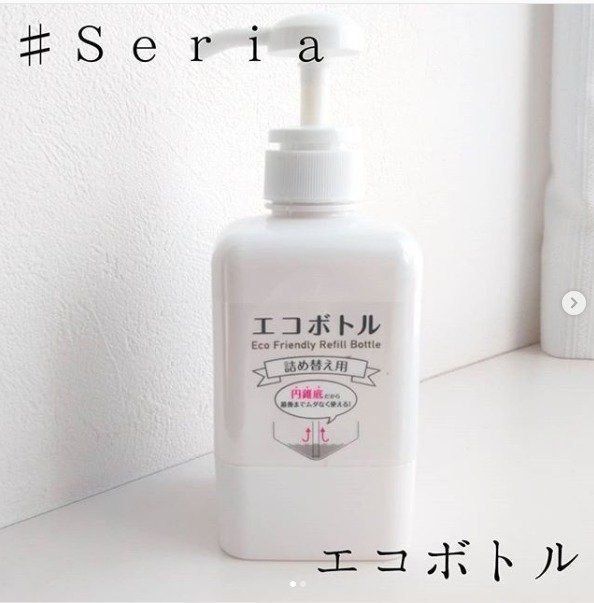 詰替えボトルは各100均でさまざまなデザインのものが登場していますが、セリアにはシンプルなデザインながら、底が円錐になっていて、最後の最後までしっかり使いきれる優秀エコボトルが販売されています。これなら少しだけ残ってしまうというストレスから解放されます。