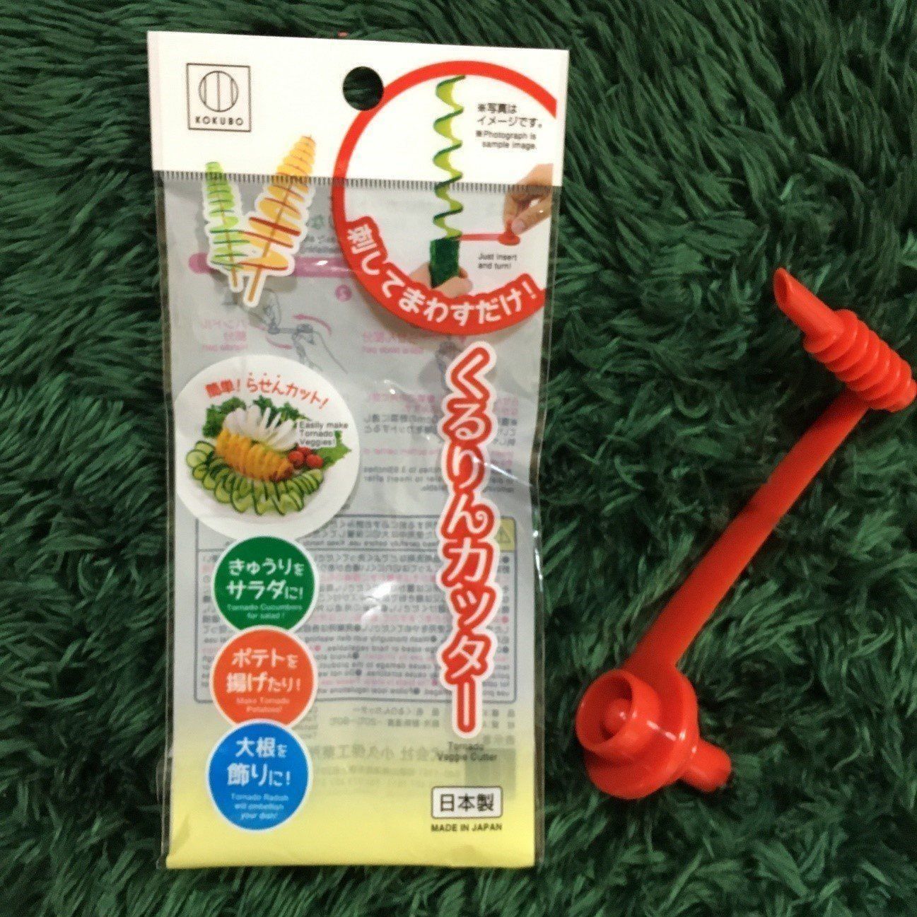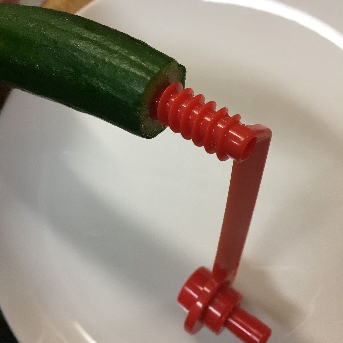 使い方は、カッターがついたパーツの先端を食材に刺して、ハンドル部分をくるくる回すだけ。たったこれだけで、らせん状にカットされた食材ができちゃいます。