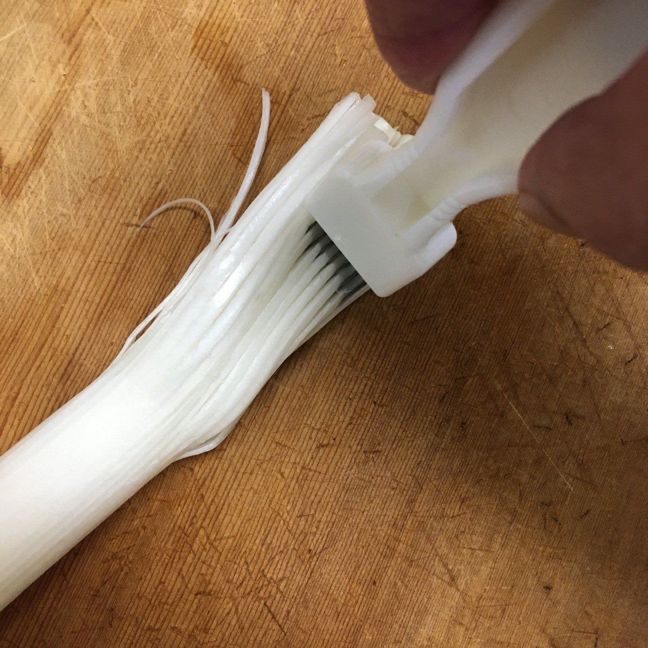 使い方は簡単、ネギの先端にカッターを当てて、引くだけ。写真のように、あっという間に均一な白髪ねぎができあがりました。
