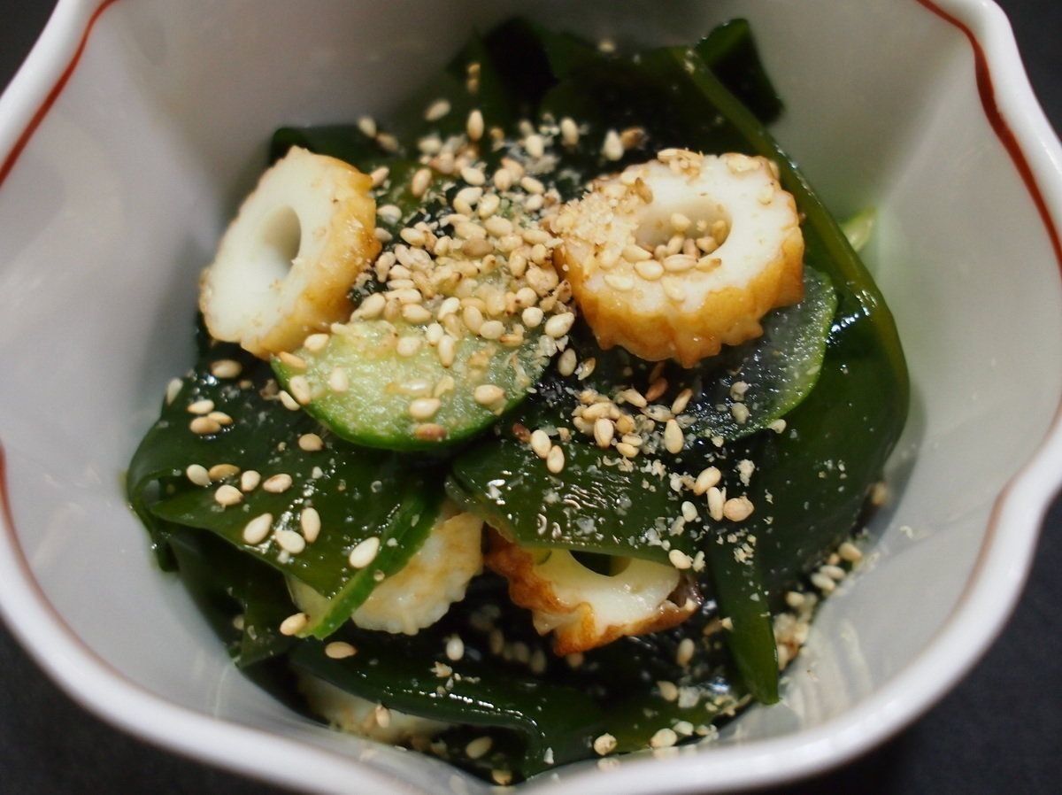 いただいてみると、甘酸っぱい味が食欲をそそりますね。タコの酢のものよりも好きかも。つくり方は簡単で、酢のものをつくる要領でまずは、キュウリを薄切りにして塩をかけてちょっと置いておきます。その間にわかめとちくわを用意。ちくわは輪切り。キュウリを水切りして、わかめ、ちくわと合わせたら、すし酢と醤油で味を調えます。お皿に盛ったら、すりごまをふりかけてできあがりです。