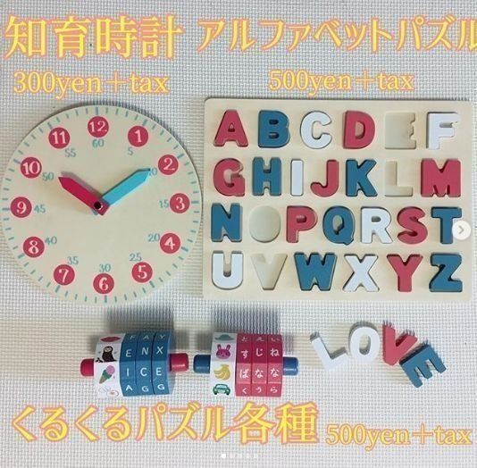 時間を覚えられる時計の知育玩具もあります。遊んでいるうちに時間が覚えられたらいいですね。その他にも、ひらがなや英語のクルクルパズルなどもありますので、お店でチェックしてみてください。
