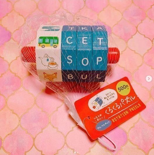 上記でご紹介した3coinsの知育玩具。こちらはアルファベット3文字のくるくるパズルです。絵に合わせて、「TEA」や「FOX」などの言葉を当てはめていくパズル。アルファベットのパズルと一緒に遊んだら英語も楽しく覚えられそうですね。