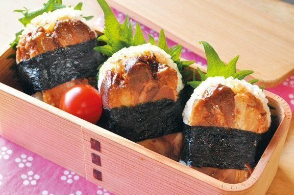 平たくにぎったおにぎりを、厚めに切った「煮豚」と青じそではさみ、のりを巻く。「煮豚」は柔らかいから厚めでも食べやすいですよ。