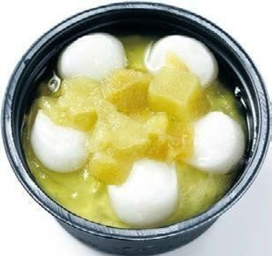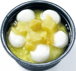 餅とメロン果肉&ソースという和洋の素材のマリアージュ。冷凍庫から出してしばらくおくと、餅の柔らかさがアップするのでオススメ!(¥210/井村屋)