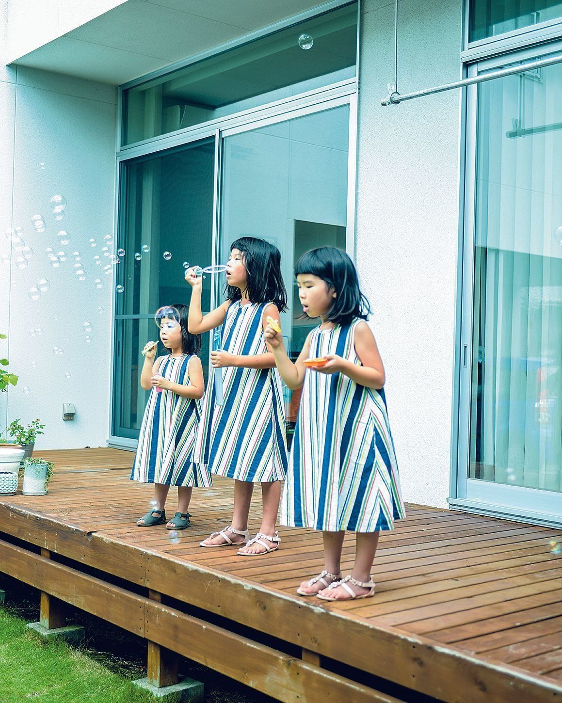 3姉妹の休日の洋服は、ついおそろいにしたくなってしまうのだそう。ママが切ってくれる前髪パッツンが3人ともすごくお似合い