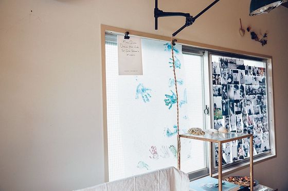 絵の具で遊びたいという子どもたち。でき上がったのは、2人の手や足跡の残る1枚の紙。子どもの成長を懐かしむことができるアートとして飾っています