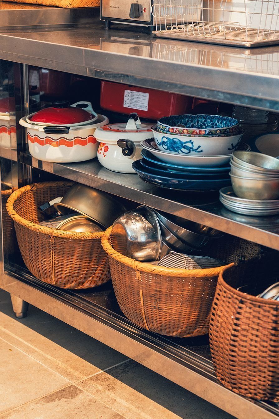 キッチンのシンク下には懐かしい感じの、昭和時代の器や台所道具がいっぱい。お皿もバットも鍋も、使っていない道具は一つもありません