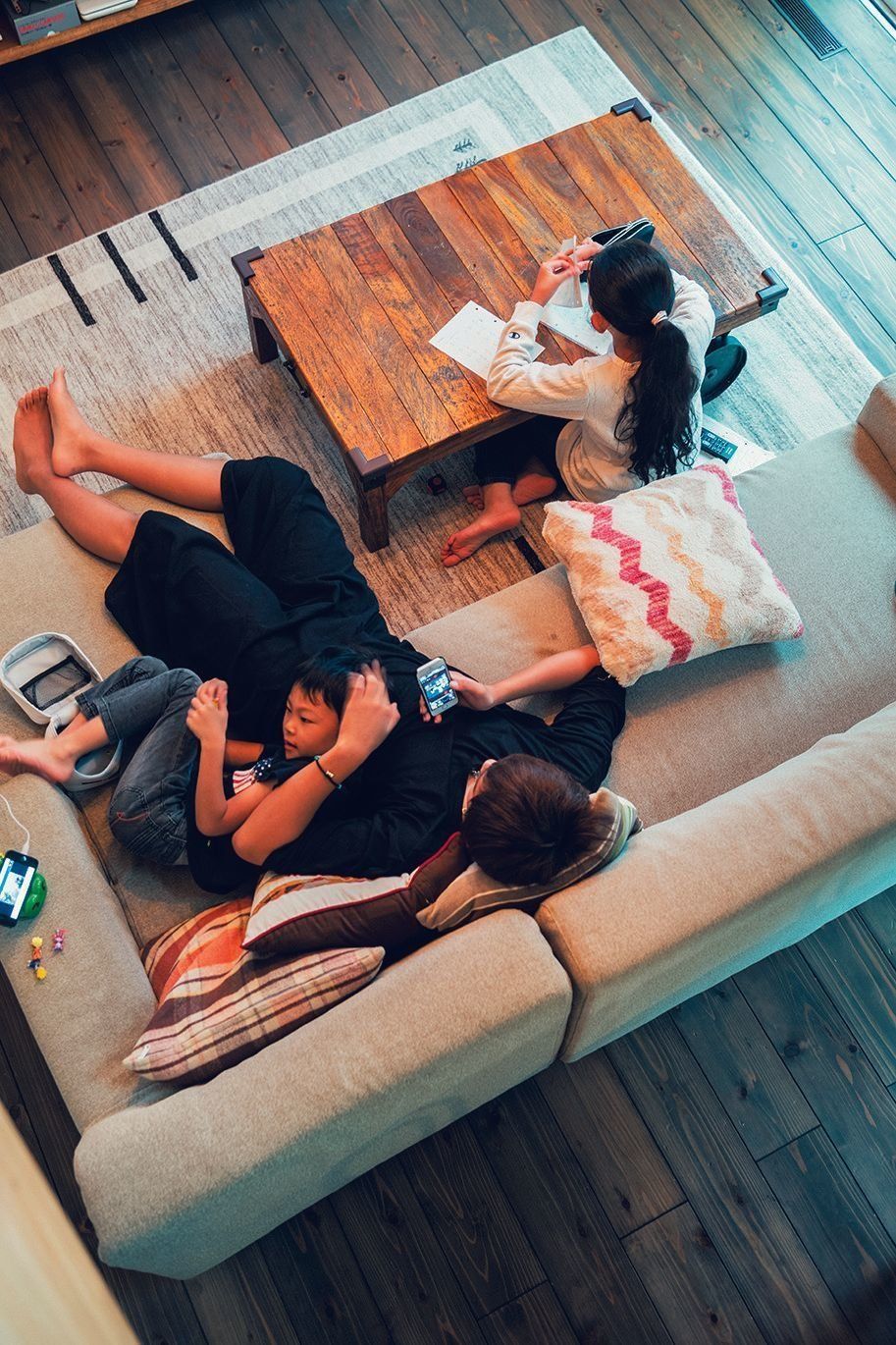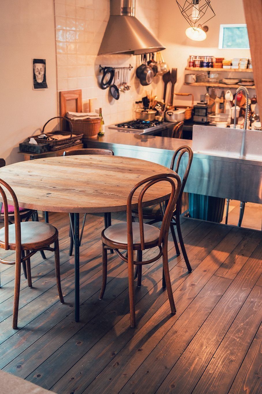 食卓はちゃぶ台をイメージしてオーダーしたもの。5人家族のいすが入りやすいよう、脚も5本。家族が、〝まーるく〞なれる、理想のテーブル