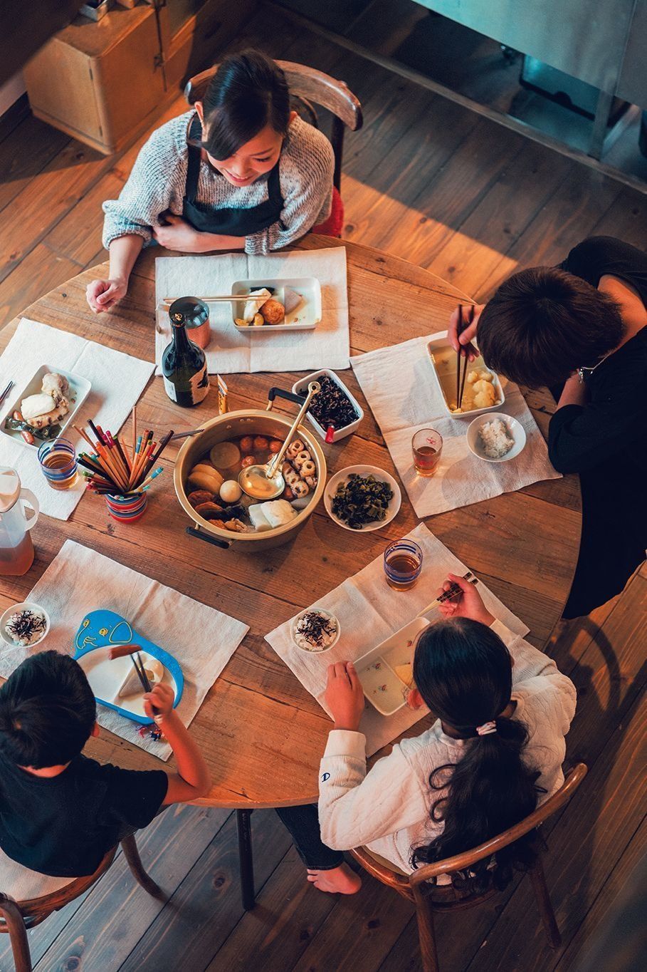 「私の作ったものを食べてさえくれていれば、まだまだ安心かなと思っています。私はキッチンにいる時間がいちばん好き。鍋を火にかけ、時間をかけておでんなんかを煮込み......キッチンに置いたスツールに座って、子どもたちの様子をみながら、大好きな焼酎をちょっと飲む。そんな時間が幸せです」