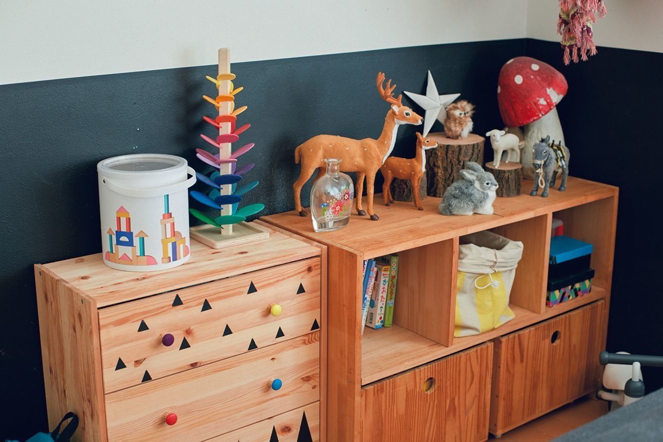 リビングの一角には、末っ子の着替えやおもちゃコーナーが。壁の下半分を塗ったり、チェストにカッティングシートを貼ったりして、インテリアを楽しんでいます。