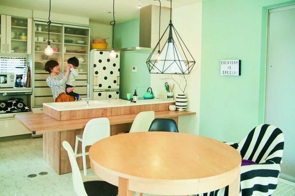 白→ミントグリーン→ネイビー→白→ペールブルー。これは、popさん宅のキッチンの壁色遍歴です。10年弱で、この壁だけで5色目。リビングは、今でこそ、ちょっと落ち着いた色合わせですが、最盛期は鮮やかなブルーの壁に赤いソファを合わせていたこともありました。「カラフルな色に囲まれていると元気が出る。気持ちが上がって、ワクワクするんです」 。