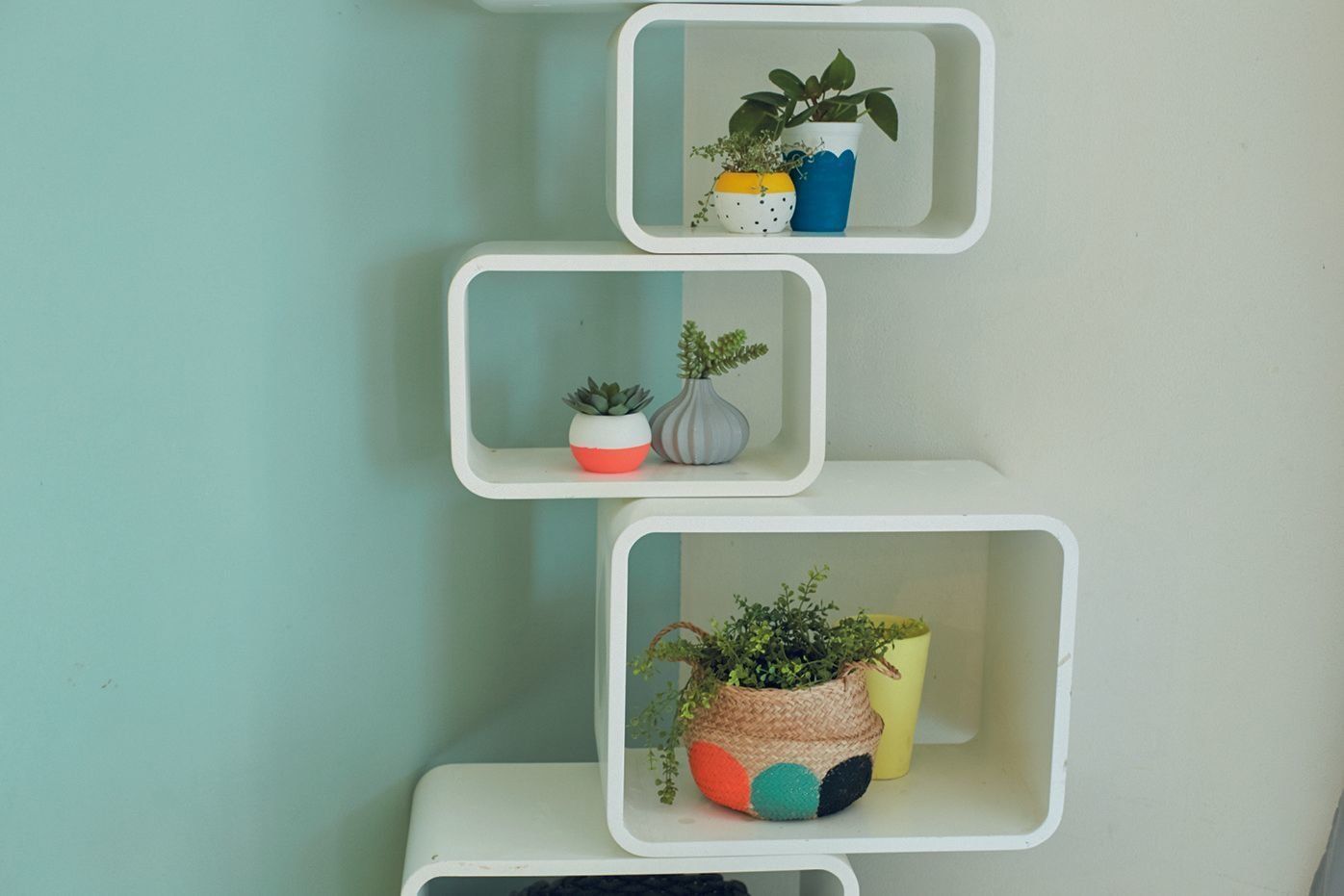 インテリアのディスプレイはどんどん変化。鉢やかごは自分でペイント。これくらいなら、あっという間だそう。3月にはこの棚がひな人形の段飾りの台になります