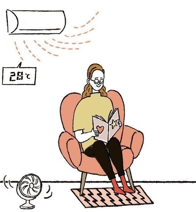 猛暑日でも冷房の設定温度は外気温の-5℃までに。扇風機を併用して涼しさを補う。