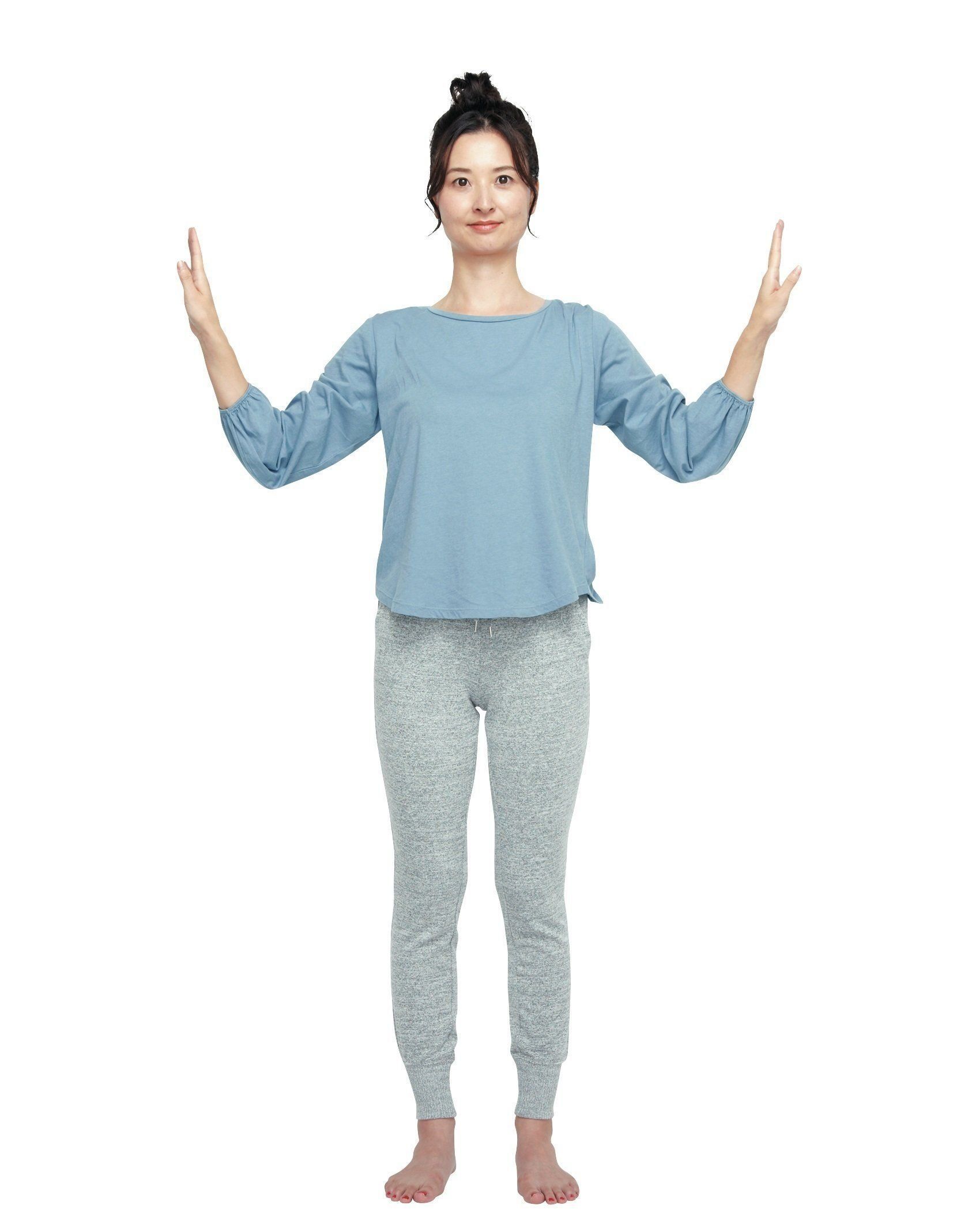(2)両手を合わせたまま頭の上まで上げる