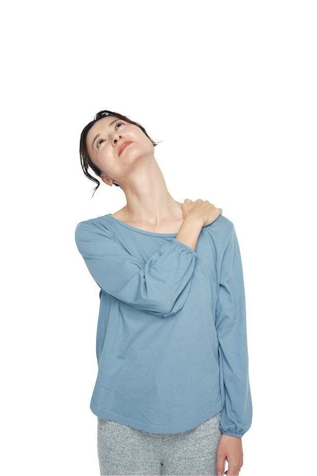 左肩を右手で押さえて首を右に倒し、そのまま上を向きます。左側の胸鎖乳突筋が伸びるのを感じながら15秒キープ。反対側も同様に。左右各1回でOK。