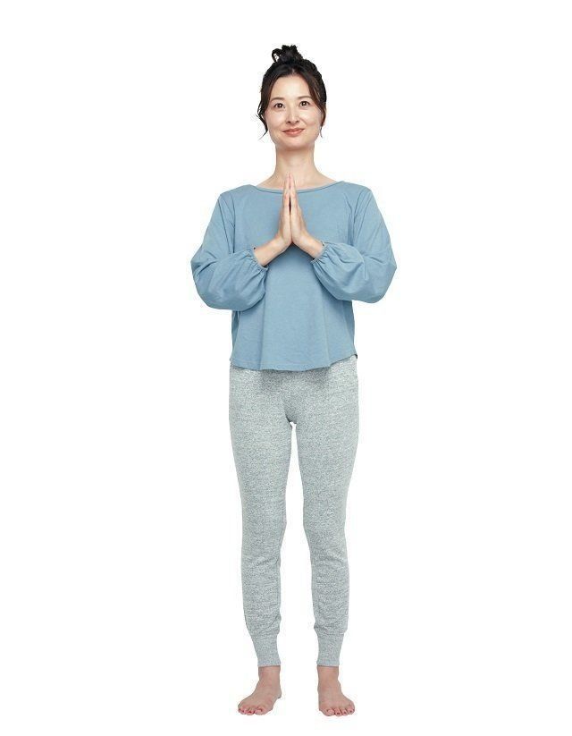 足を自分に合った自然な幅に開き、胸の前で手のひらを合わせます。