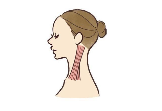 首の前側の耳の後ろから鎖骨にかけてあるのが胸鎖乳突筋。首が前に出た状態が続くとこの筋肉が縮んで緊張し、カチカチに。首を正しい位置に戻すためには、まずはここをほぐしてみましょう。