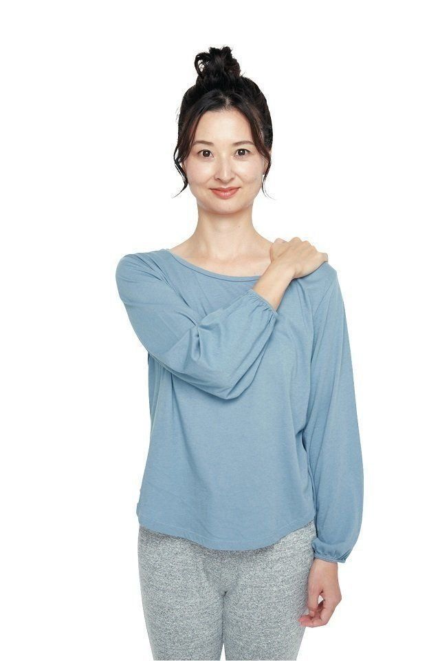 右手を左の肩に当て、肩が上がらないように押さえます。左手は下に下ろしておきましょう。